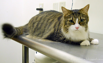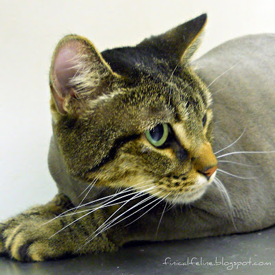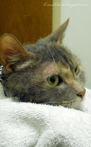 One of the last cats I did was in very poor health. She was matted. She was covered in diarrhea. She was very thin, her skin was even thinner. She was very agreeable for grooming - partly because she was too sickly to fuss too much - but mostly because she's a nice little cat. I was as careful as possible, but sometimes there's just nothing to prevent nicking or cutting the skin. I knew it would be rough going before I even started, but it doesn't make it any easier. Her delicate skin couldn't take much dematting, so even combing out the tangles would have the potential to rip her skin. It was a long, slow and gentle grooming. Even so I had to bring her over so the vet could check her few nicks and glue them together. She reminded me that it can happen and is one of the dangers of grooming cats, especially ones in poor health. The injuries were minor, and given the condition, unavoidable.