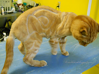 that uncommon for a cat! So for the first 15 minutes, Tiger stood. It is very difficult to groom a standing cat. Way hard. Trying to clip in some type of abstract pattern? Really, really hard!